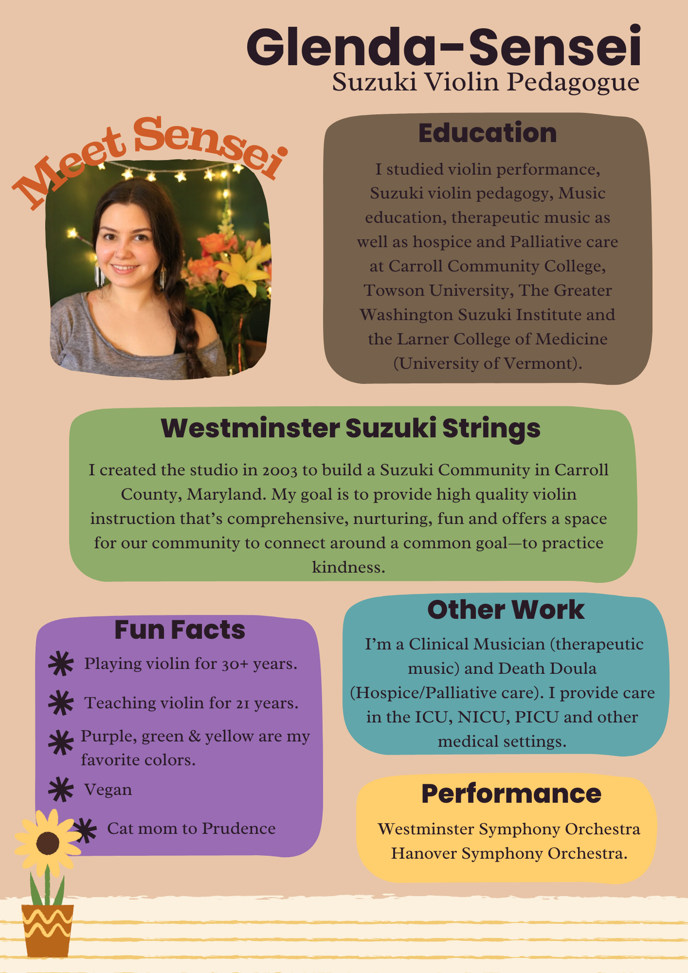 We use a lot of Japanese customs and etiquette in the studio. We use the international bow as a greeting and Japanese honorifics to denote respect not only for the person but to acknowledge the level of mastery attained. Dr. Suzuki was from Japan and asked his teachers to instruct students with these customs. Much of the Suzuki philosophy stems from Japanese culture and is the basis for how/what/what we do.