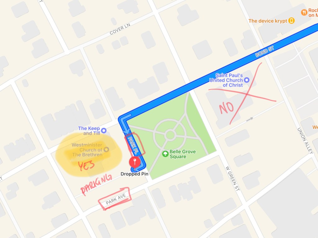 NOTE: There are two churches across from each other, separated by Bell Grove Square park. Make sure you’re at the correct church! See the map below.