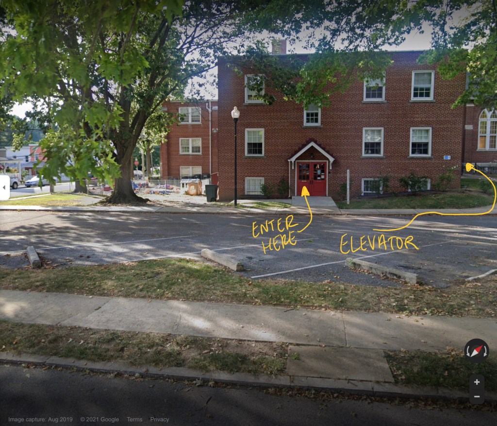 Enter through the double red doors off the parking lot on the Park Ave. side of the building (see photo). Note: All doors on this building are red. Make sure to use the ones off the parking lot and not the street.